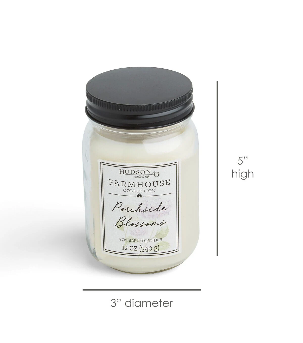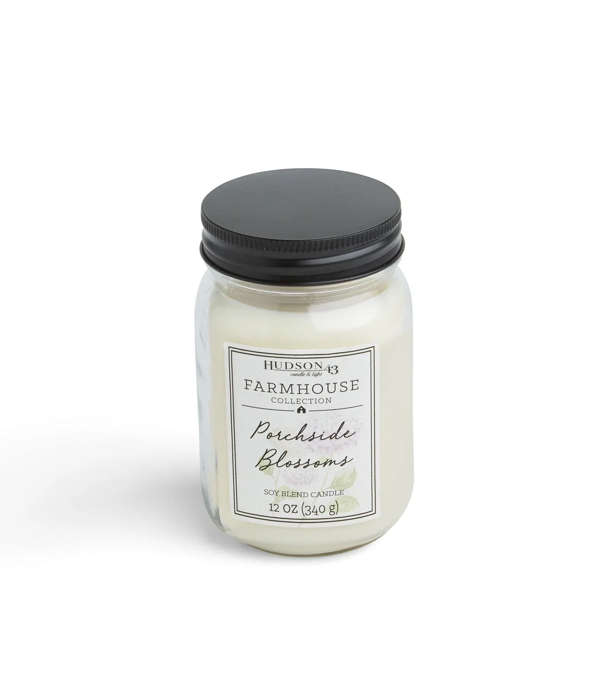 The Hudson 43 Farmhouse Collection Porchside Blossoms Mason Jar Candle offers a modern yet rustic fragrance in a beautiful package that goes with any decor. This 12-ounce clear mason jar comes with a white wax candle and a matte black lid that screws on. It includes the notes of blooming sunflowers and fresh linen.