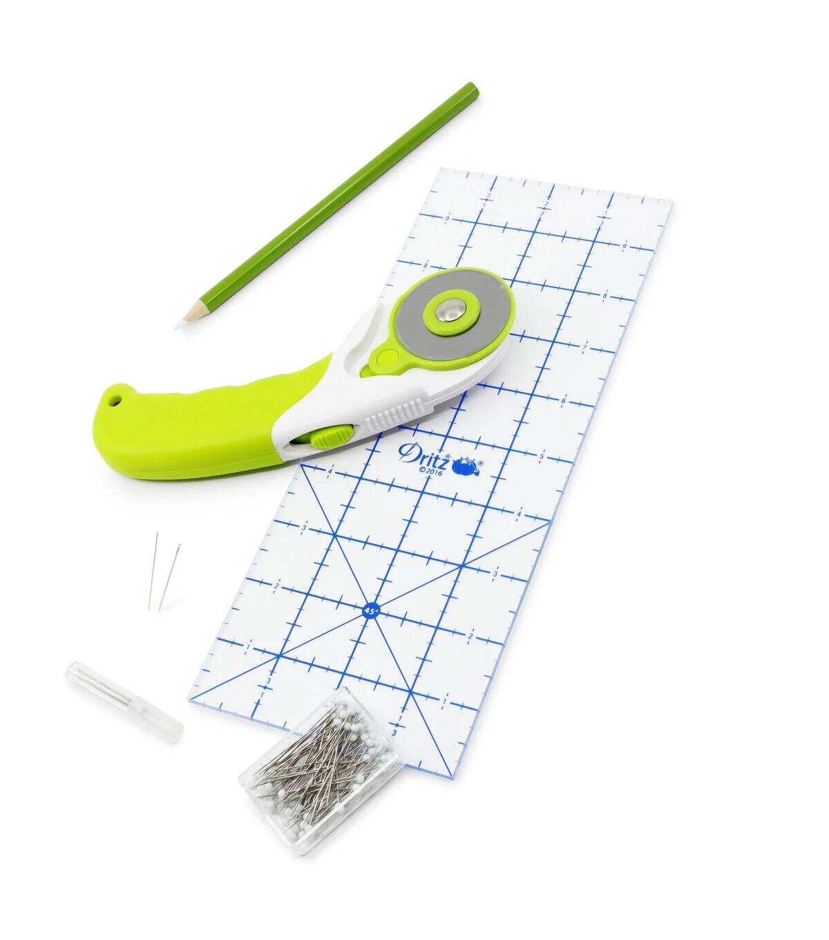 Embark on your quilting journey with the Dritz Essential Quilt Kit for Beginners. This kit includes a 36-page color book with step-by-step images of quilt-making basics and a glossary of common quilting terms. It also contains a 45 mm rotary cutter, a 4 x 10-inch acrylic ruler, marking pencil, hand needles and glass headpins.