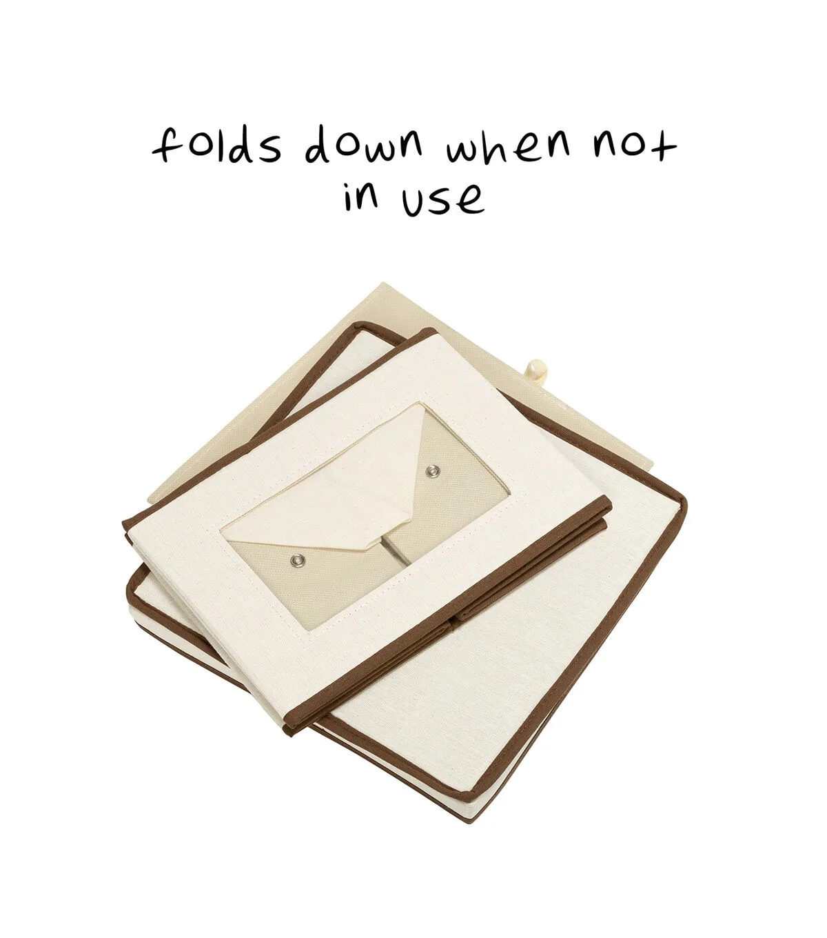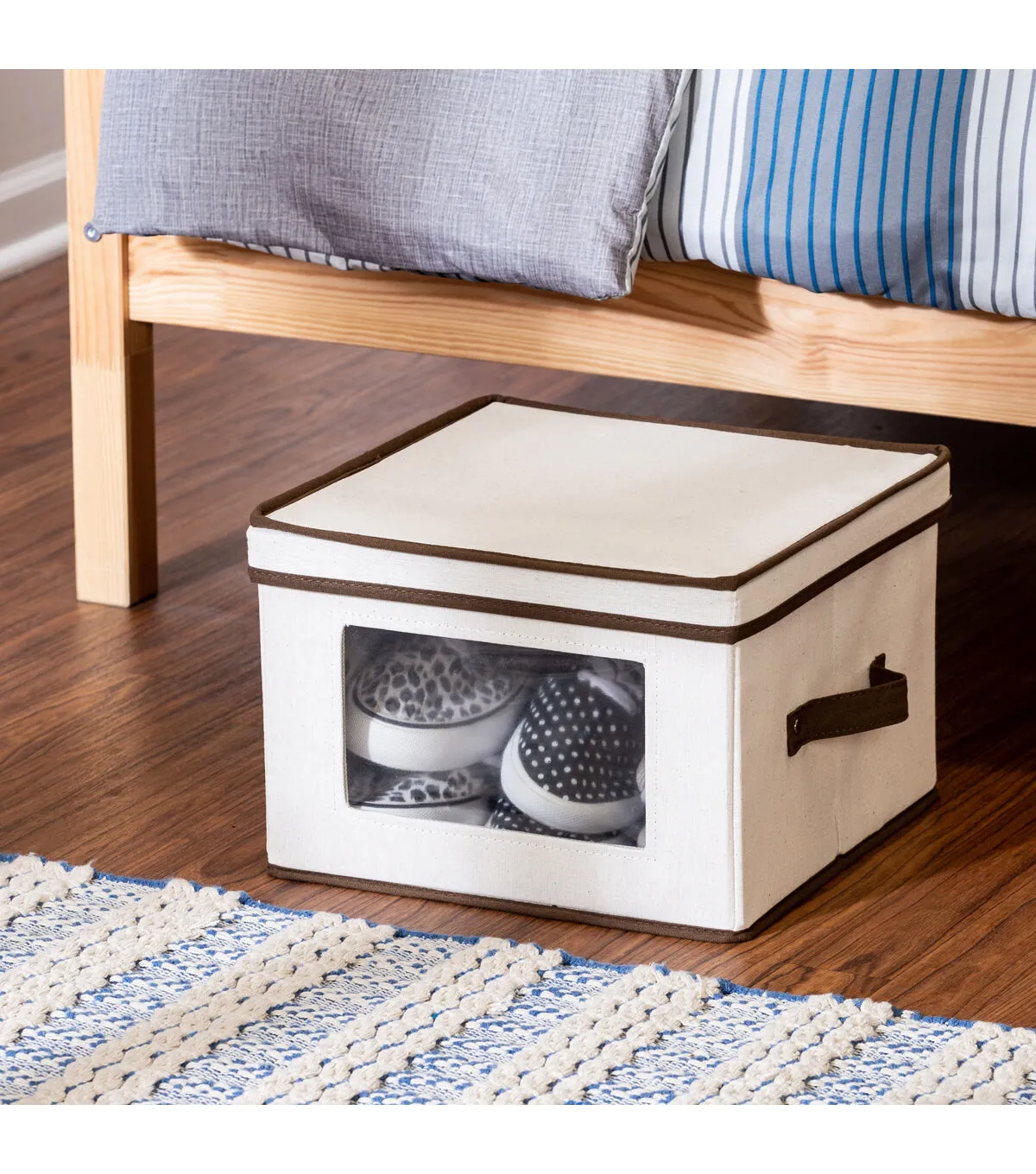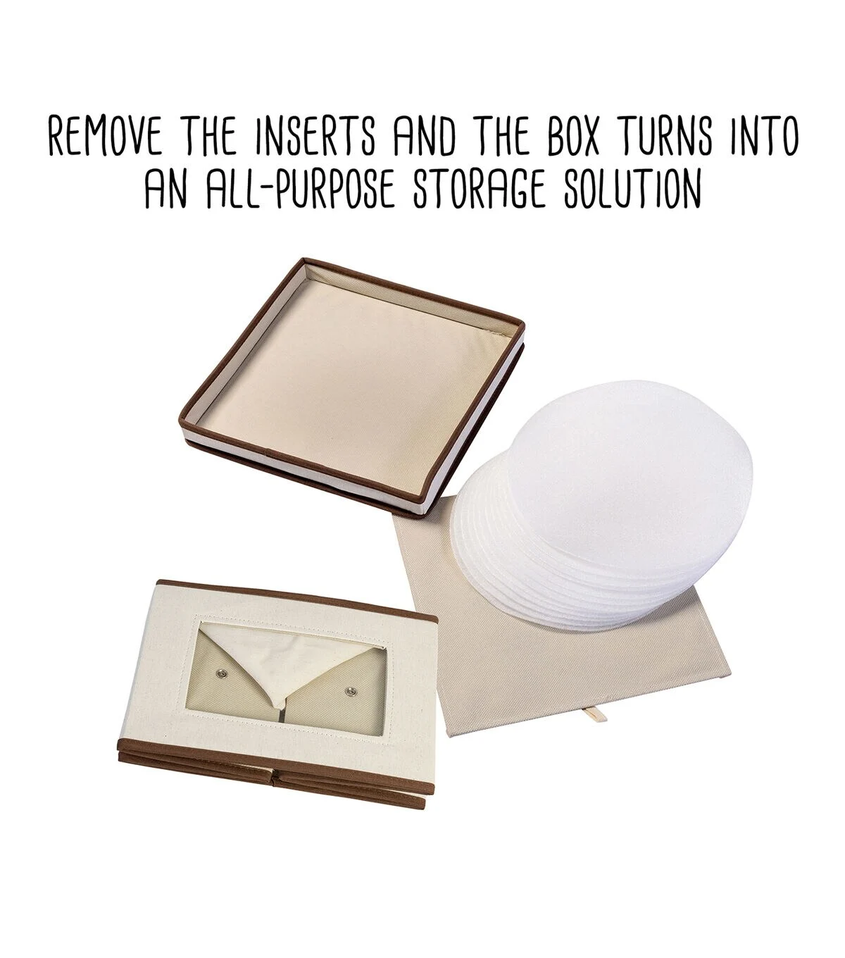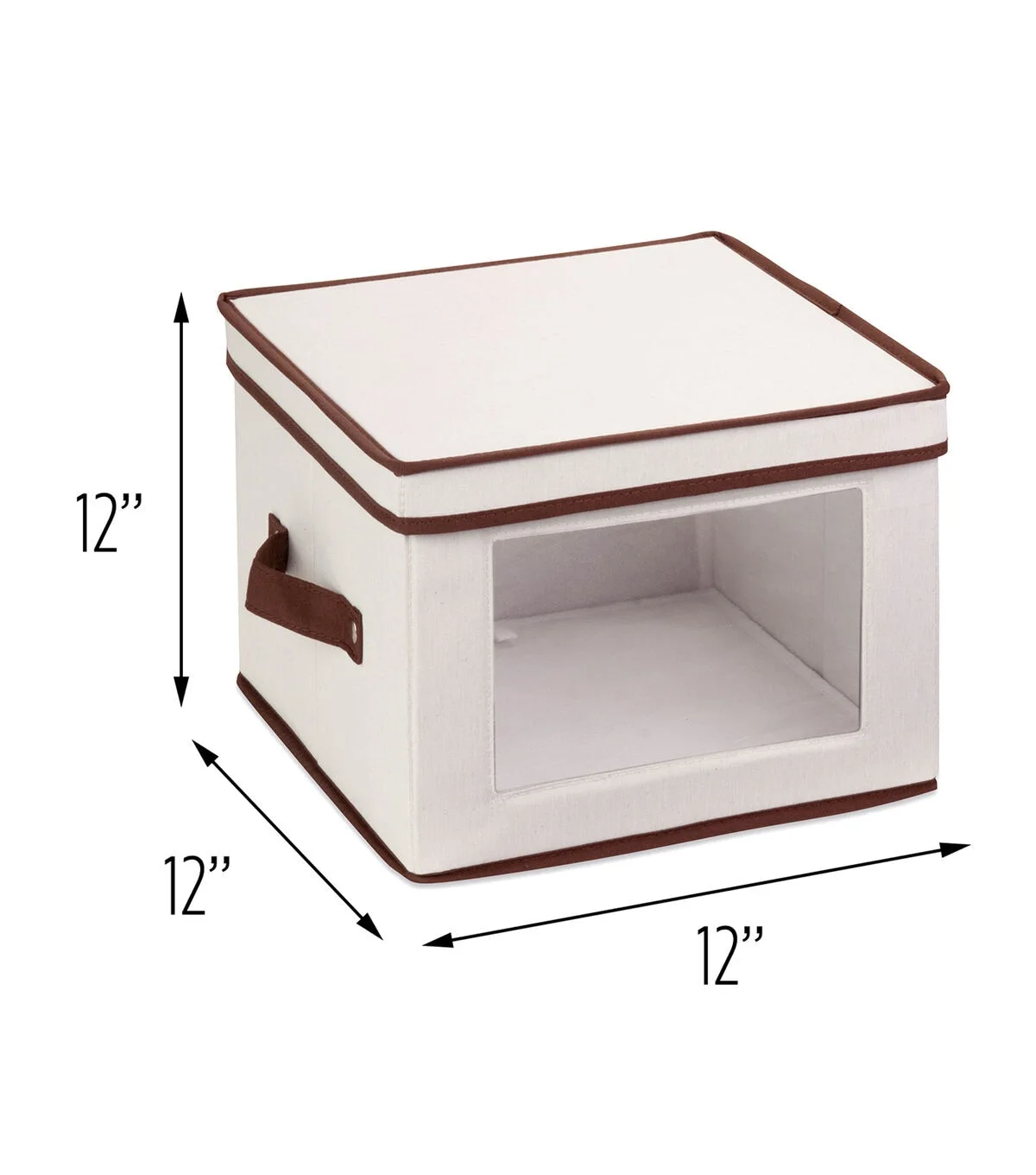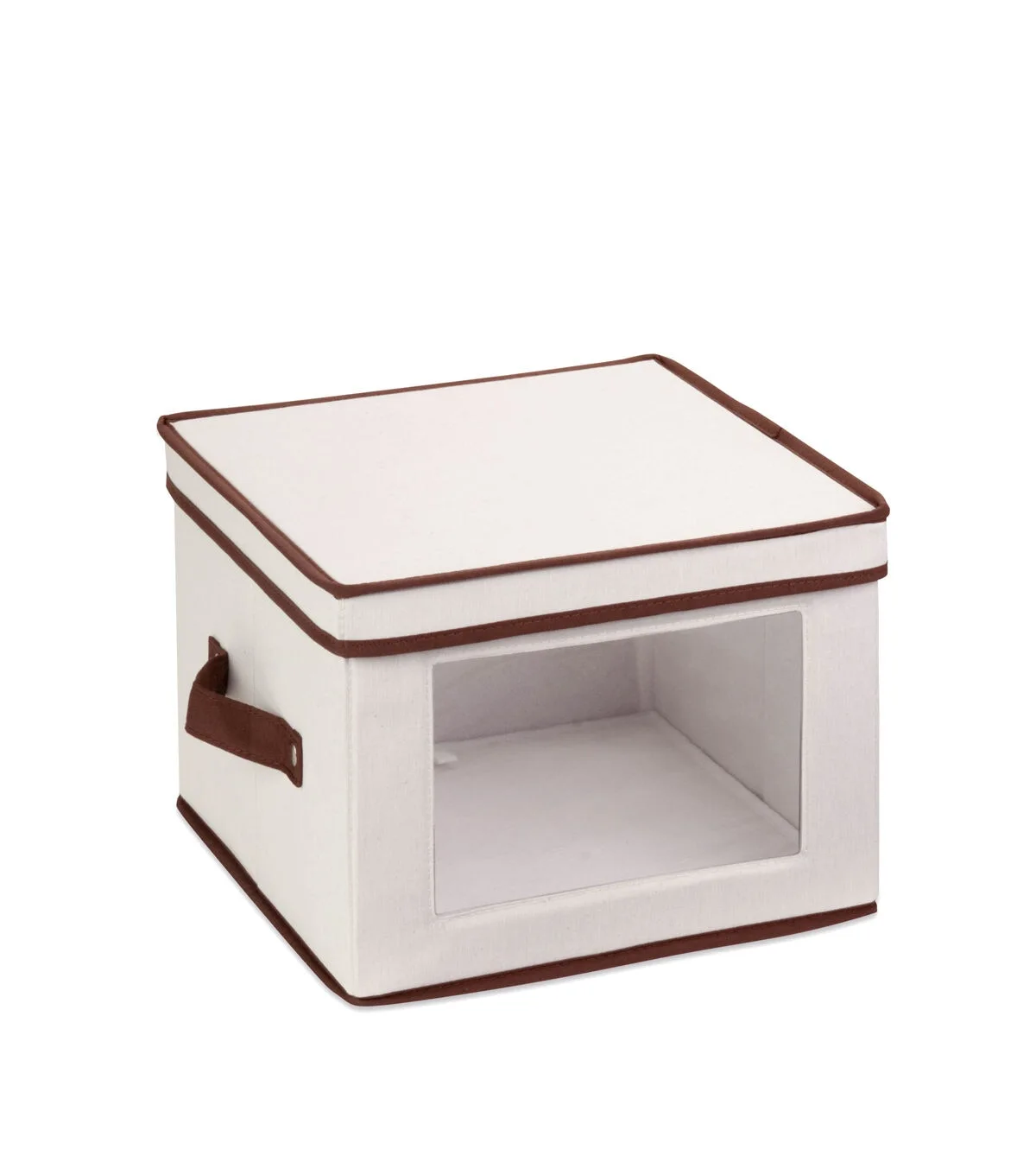 Honey-Can-Do SFT-02063 Dinnerware Storage Box, Natural/Brown. Store up to 12 standard-sized dinner plates in this 12x12 inch storage box. The clear view window lets you easily see the contents while the lift off lid simplifies access. Protective inserts help safeguard against chips or scratches. Remove the dinnerware inserts and this storage box turns into a great closet organization tool. Store scarves, ties, socks, gloves, or hats. In classic off-white with brown accents, this stackable storage box will instantly upgrade any pantry or closet. Made of polyester and cotton canvas.