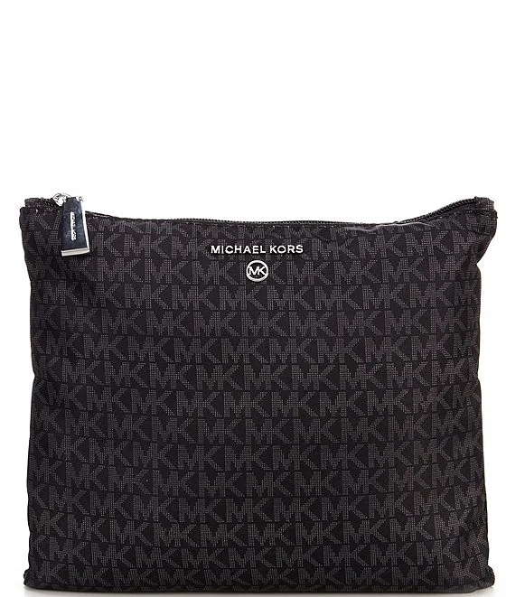 From Michael Kors, the Jet Set Black Signature Logo Travel Large Packable Tote Bag features: